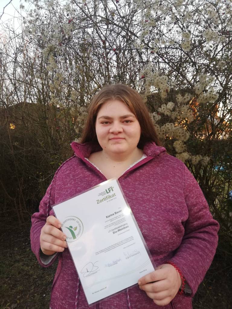 Die Jungwinzerin Karina hat erfolgreich den LFI-Zertifikats-Lehrgang Bio-Weinbau absolviert. Es werden damit die bereits seit Jahren gestellten Weichen in eine umweltgereichte Produktion nochmals intensiviert.